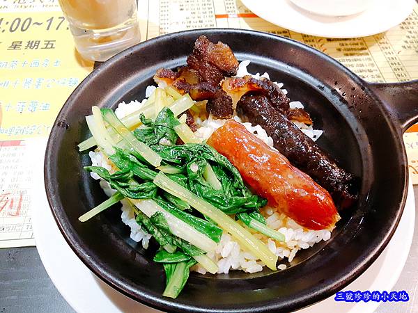 這個不是煲仔飯唷~是<蒸飯>,米飯吃起來的口感及香氣會比較不同,但對珍珍來說沒差,因為我只想要吃那個臘味香腸啊!